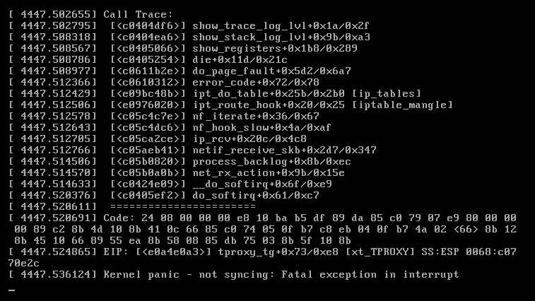 hi, I have being modified linux-kernel-2.6.22 to support the function as tproxy dose to linux-kernel-2.6.24 these week. And now, the socket match can work well, while the TPROXY target meet some problems. kernel's panic info was shown in the slave file picture. iptables rule was as bellow: iptables -t mangle -A PREROUTING -p tcp --dport 1080 -j TPROXY --on-port 2080 As you see, I didn't specify the --tproxy-mark option, that's say the kernel panic info were produced during find the target listenning socket. when recv a remote syn pkt preduced by command telnet 10.24.38.28 1080, tproxy kernel die. Any suggestions to solve this problem, thank you! regards! ----------------------------- kudiejlq